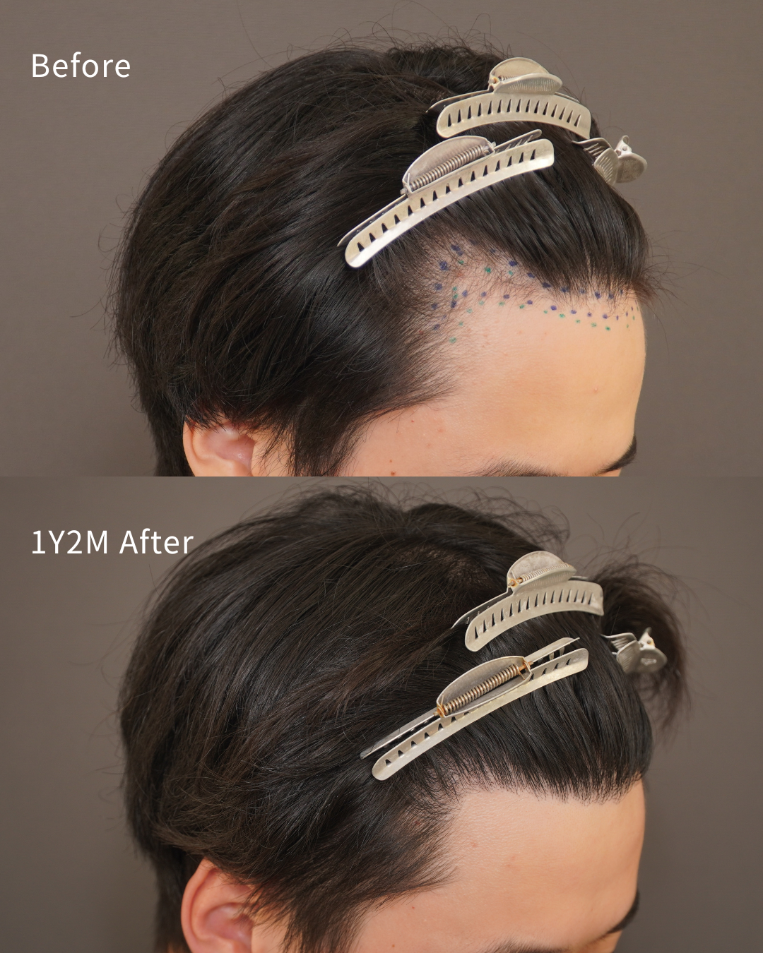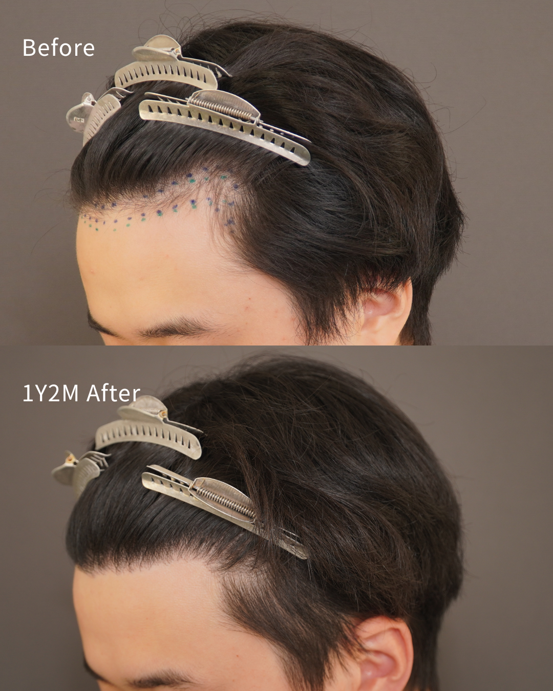ただ、無毛部への植毛は透け感が出やすく、場合によっては不自然な印象につながるため、当初は青のラインでの手術をおすすめしました。